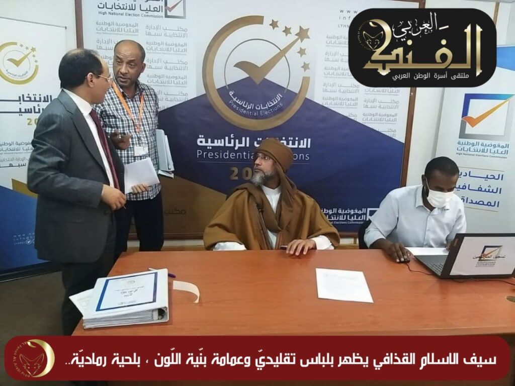 كما ذكرت الوسائل الاعلاميّة ظهور سيف الاسلام القذّافي بعباءة تقليديّة وعمامة بنيّة اللّون ولحية رماديّة بمدينة سبها جنوبيّ البلاد ضمن مرشّحيها، وهو يوقّع ملفّ ترشّحه.