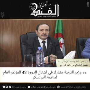 يترأس عبد الحكيم بلعابد، وزير التربية الوطنية، الوزاري الجزائري المشارك في أشغال الدورة الثانية والأربعين (42) للمؤتمر العام لمنظمة اليونسكو. الذي سينعقد في الفترة الممتدة من 07 إلى 22 نوفمبر 2023، بمقر اليونسكو بباريس، فرنسا.