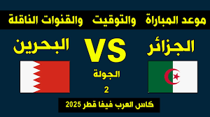 موعد المباراة: تُقام مواجهة الجزائر والبحرين يوم السبت 6 ديسمبر 2025، عند الساعة 16:30 بتوقيت قطر والسعودية والأردن والكويت والبحرين، والساعة 14:30 بتوقيت الجزائر.