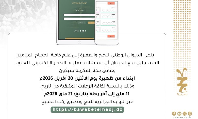 كشف الديوان الوطني للحج والعمرة عن إعادة فتح عملية الحجز الإلكتروني لغرف الإقامة بفنادق مكة المكرمة، لفائدة الحجاج المسجلين لديه، ابتداءً من منتصف نهار يوم الاثنين 20 أفريل 2026.